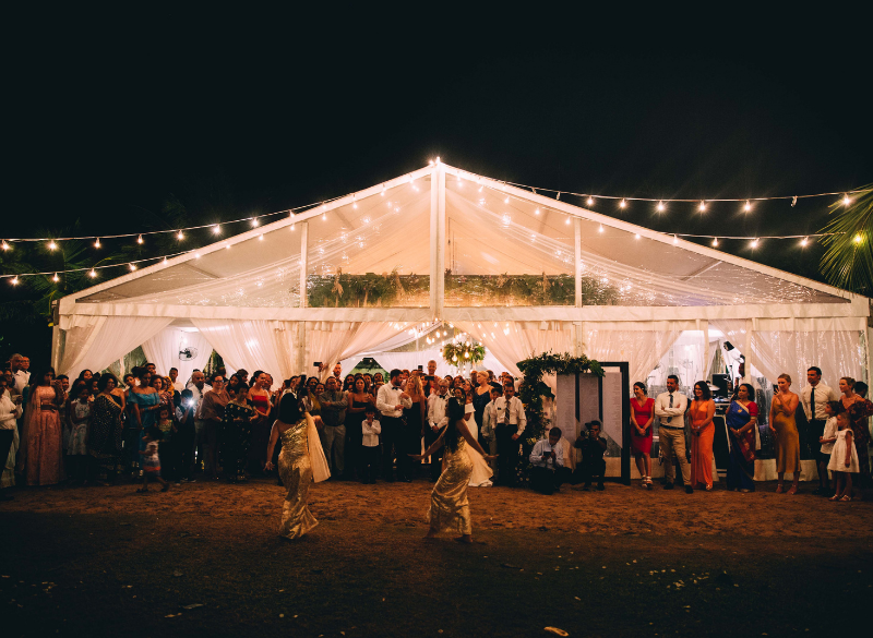 Suhana and David’s wedding was a modern-day’s fairy tale come true, as they started their “happily ever after” at a rustic-chic themed ceremony held at a luxury resort hotel in Weligama. The regal tones of black, gold and dark forest greenery sang in perfect harmony with the contrasting lilac accents of the flowers, against the mesmerizing sea as the backdrop. The bride in her graceful wedding gown with her cascading bouquet was escorted to the aisle by drummers. The pair cast the picture of a perfect couple as they exchanged their vows, on a black hexagon structure decorated with palm leaves, pampas grass, white phalaenopsis orchids, and purple filler flowers. The reception was held under a marquee in the garden, which had a dance floor beautified by hanging floral décor and drop lighting. It was refreshing to work with this adoring couple, as they had such attention to detail, which matched ours. At their request, palm tree wedding logos were incorporated into most aspects of the wedding, including the invites, tea tins for wedding favors, cushion covers at the lounge, and even the mosquito repellent bottles that were provided. Some of the highlights of the festivities were the surprise dance arranged by the bride’s mother, a firework show, and last but not least, Suhana a former professional international DJ taking control as the DJ at the after party